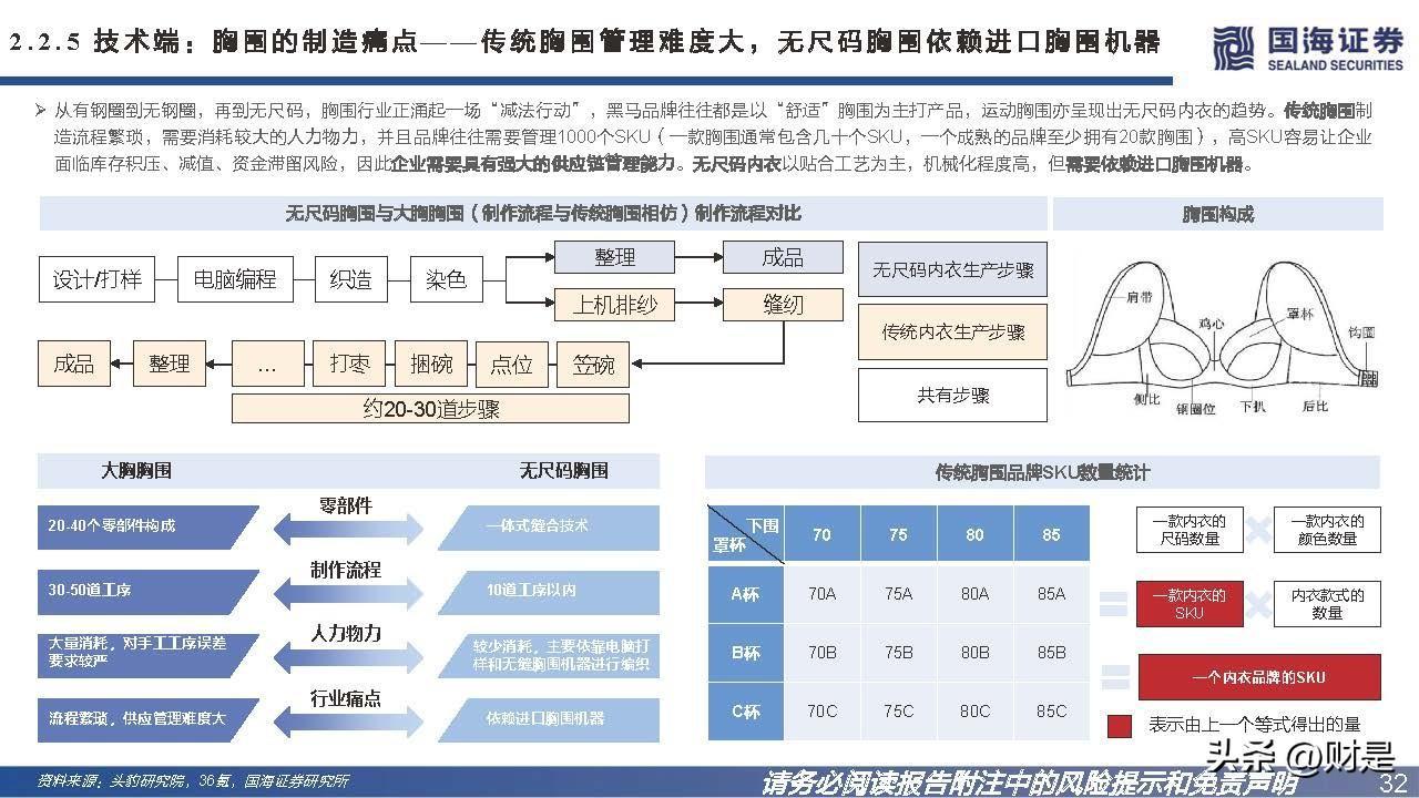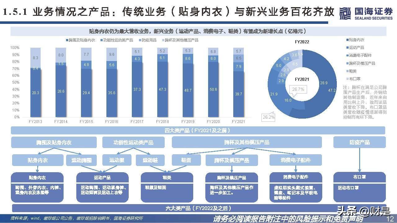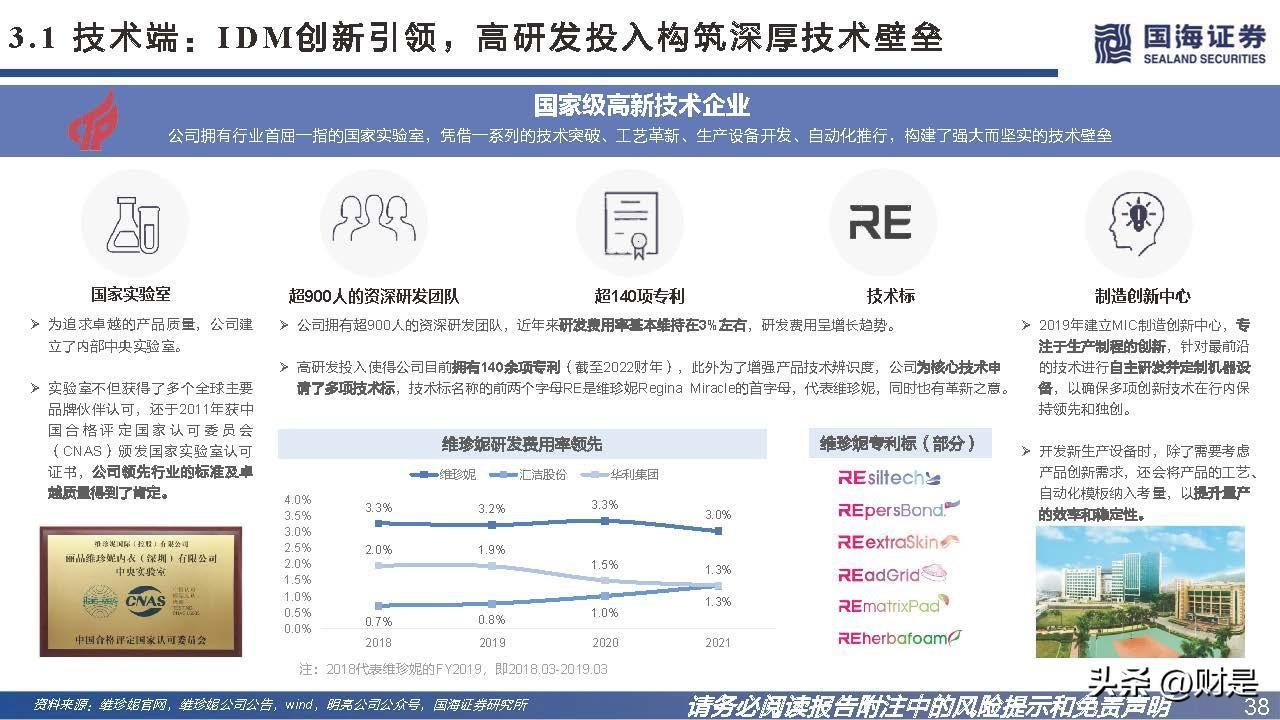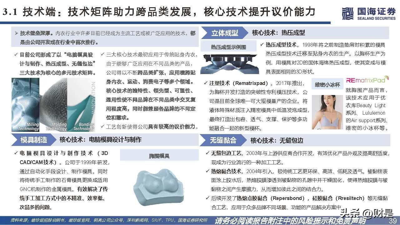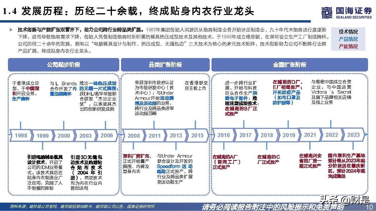 技术创新与产能扩张双管齐下,助力公司跨行业跨品类扩展。1985年集团创始人洪游历从垫肩制造业务开始涉足制造业,九十年代末垫肩流行度逐渐 下降,进而导致垫肩需求下降,创始人凭借制造垫肩时所积累的模具热压成型技术及其他技术,于1998年成立维珍妮,在深圳设立生产工厂制造胸杯。 公司历经二十余年的发展,拥有以“电脑模具设计与制作、热压成型、无缝包边”三大技术为核心的多元技术矩阵,技术创新助力公司不断跨行业跨 产品扩展,终成贴身内衣行业龙头。