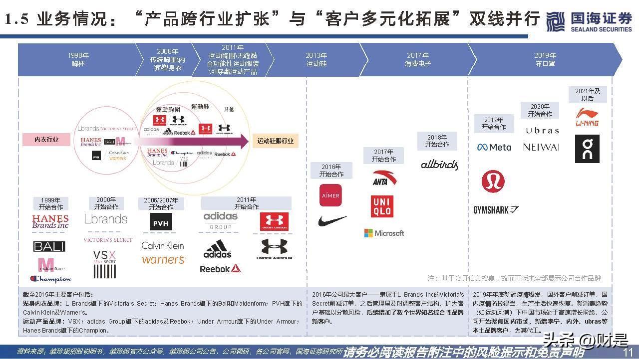 贴身内衣制造业龙头,合作全球领先品牌客户。维珍妮是全球领先的贴身内衣制造商,合作Nike、Adidas、优衣库、维密等全球领先品牌,为其提供一系列贴身内衣和 功能性运动类产品。根据弗若斯特沙利文报告,按2014年的产量统计,公司是行业内全球第一大胸围制造商,占市场份额1.0%。2016年公司是亚洲第一大贴身内衣制 造商,市场份额为2.5%。