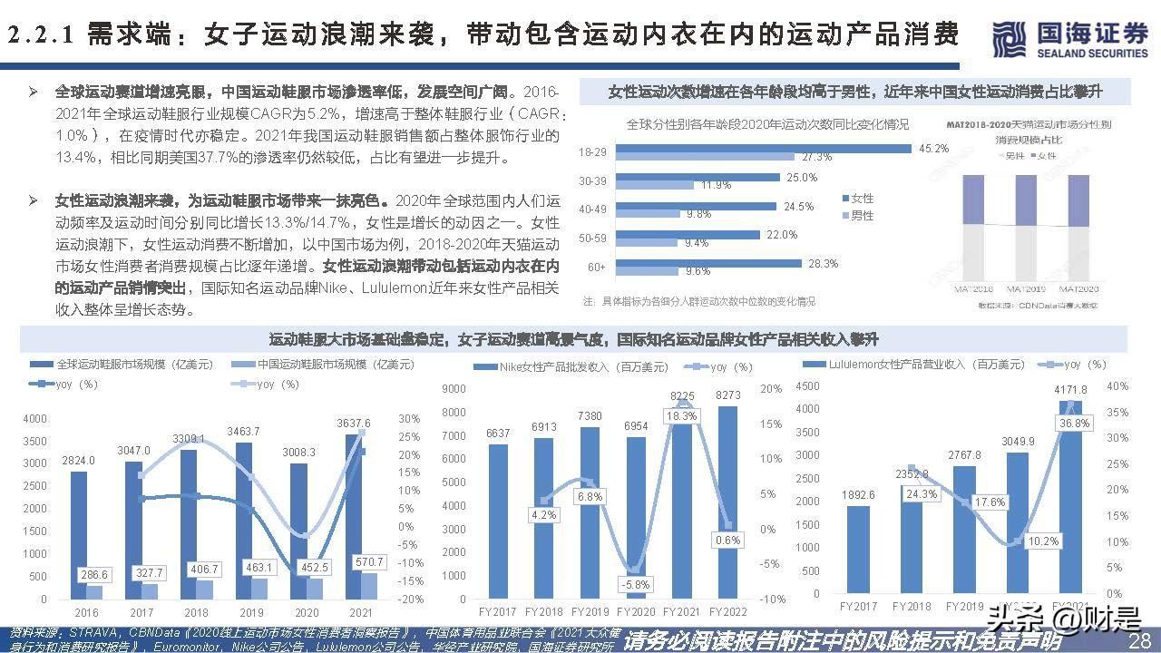 运动内衣市场发展空间广阔。随着女性参与运动健身的人群数量及频次提升,以及运动休闲风穿搭浪潮的兴起, 运动内衣市场规模未来可期。以美国为例,2013-2018年美国内衣市场格局发生较为明显的变化,头部内衣品 牌集中度降低,同时期Nike、Under Armour、Adidas、H&M等运动内衣品牌和快时尚品牌在女性内衣市场的 份额呈上升态势。鉴于中国人民经常锻炼的比例与美国相比仍然较低(美国2019年18-25岁/26-45岁分别有 38%/43%;中国2020年20-29岁/30-39岁分别有30%/28%),可见中国运动内衣市场正处于快速发展阶段。