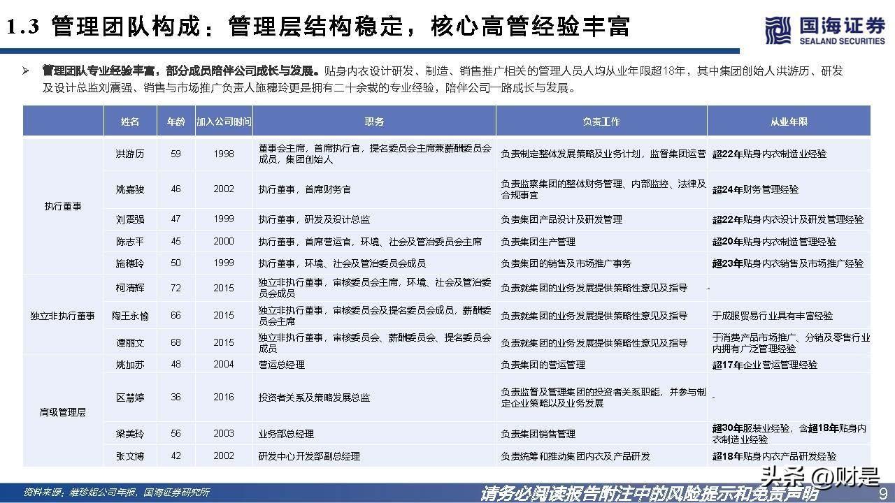 管理团队专业经验丰富,部分成员陪伴公司成长与发展。贴身内衣设计研发、制造、销售推广相关的管理人员人均从业年限超18年,其中集团创始人洪游历、研发 及设计总监刘震强、销售与市场推广负责人施穗玲更是拥有二十余载的专业经验,陪伴公司一路成长与发展。
