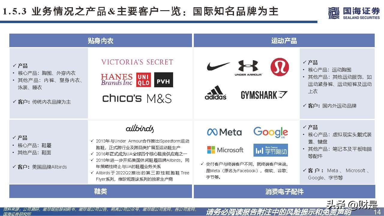 维珍妮为全球贴身内衣制造龙头企业,客户结构已完成传统内衣品牌为主向运动休闲品牌为主的转变。维珍妮是全球领先的贴身内衣制造商,根据弗若斯特沙利文报告,按2014年的产量统计,公司是行业内全球第一大胸围制造商,占市场份额1.0%。多年来公司实现了一连串产品跨类别和跨行业的扩展,从传统贴身内衣产品逐步扩展至运动贴身内衣、消费电子、防疫用品(布口罩)等产品,产品组合日益丰富。公司合作Nike、Adidas、优衣库、维密等全球领先品牌,为其提供一系列贴身内衣和功能性运动类产品,客户结构以运动休闲品牌为主。