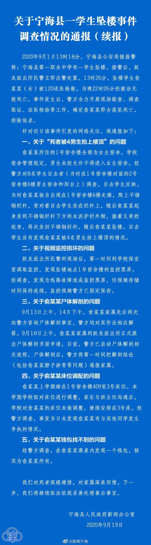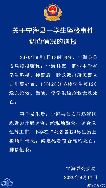 9月17日,宁海县公安局发布“关于宁海县一学生坠楼事件调查情况的通报”,通报称,2020年9月1日13时18分,宁海县公安局接报警称:宁海县第一职业中学有学生坠楼。事件发生后,宁海县公安局迅速组织警力开展调查。经现场勘查、调查取证等工作,不存在“死者曾被4男生抬上楼顶”情况,确定死者符合高坠死亡,排查他杀。