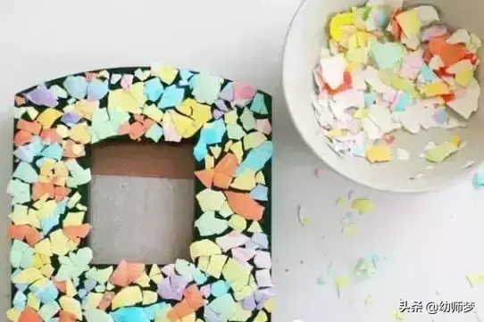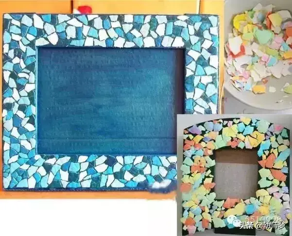 这时候胶水派上用场咯,用各种颜色的蛋壳作为相框框边装饰品,使用胶水固定在相框上,可以从一个角先开始,这样无规则的粘帖,尽量让蛋壳间只露出较少的间隙,按着上图的效果粘帖。