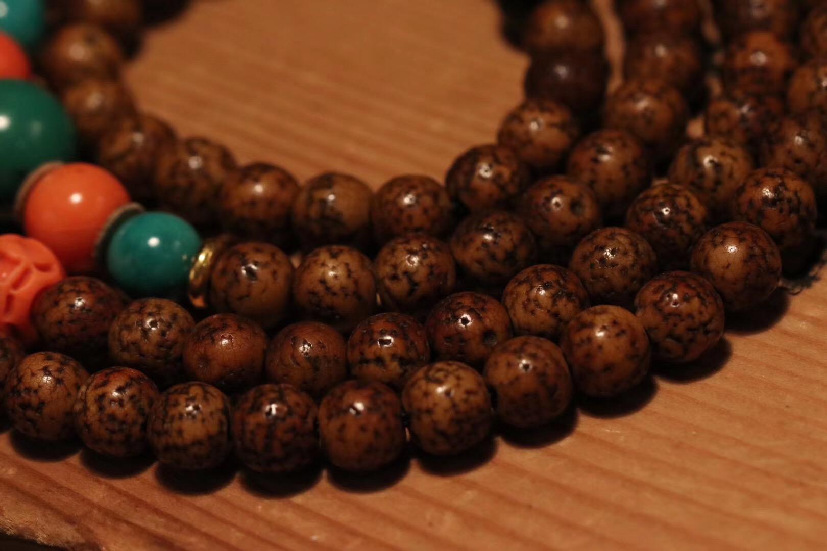 【老星月·念珠】极品大年份,爆老星月,开片细腻、均匀回缩纹明显,孔道磨损到位,包浆浑厚,纯粹的老星月,原配足数108粒,7mm.