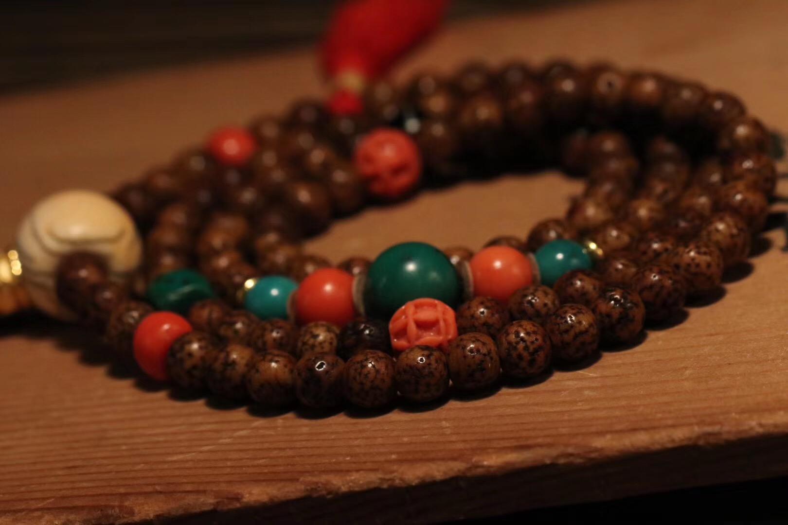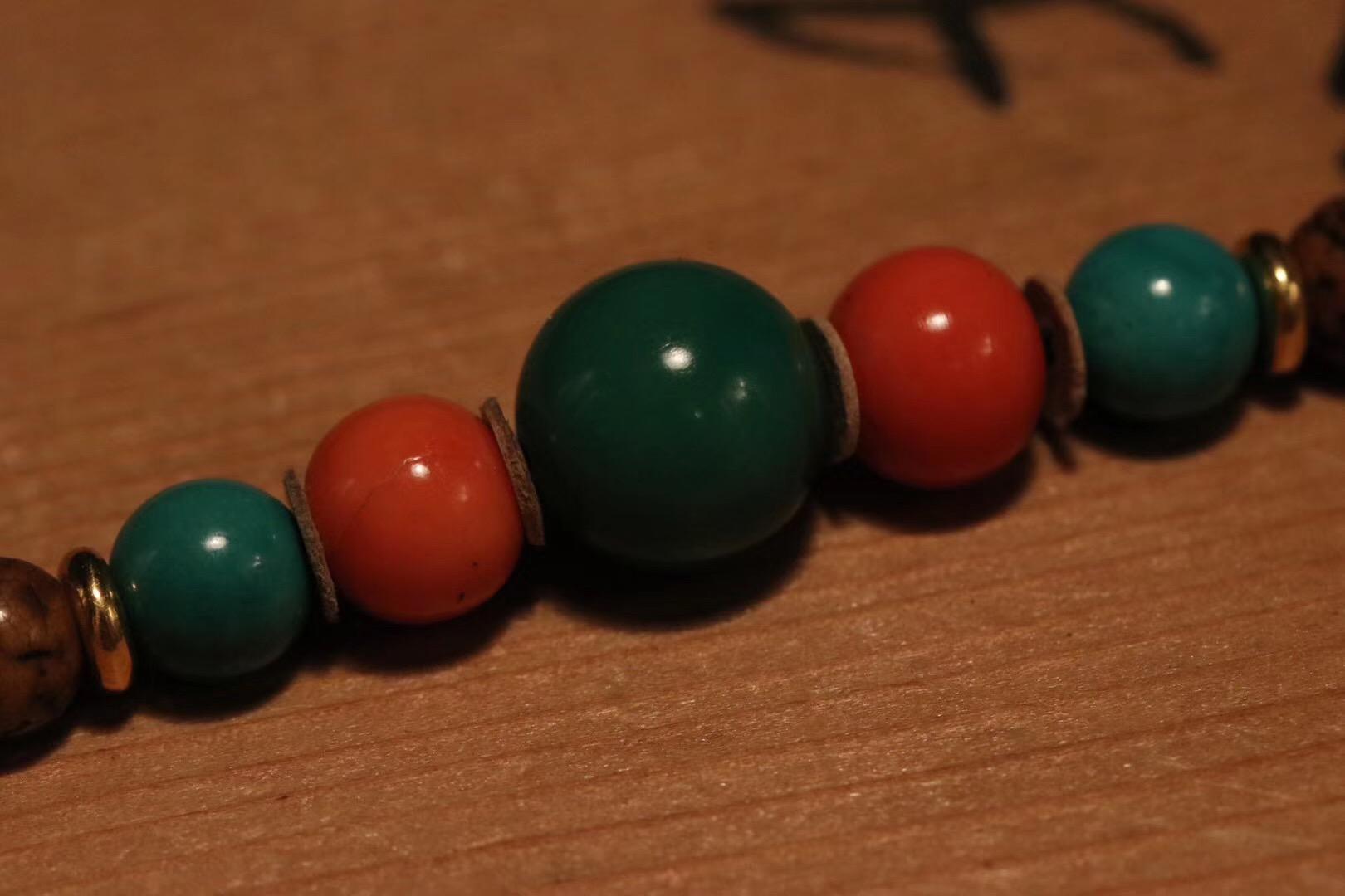 配饰:老松石顶珠,老momo珊瑚对珠,老松石对珠,老药师,老松石骰子,老momo雕刻珊瑚对珠, 阿卡珊瑚对珠,老牙头, 24k纯金佛塔,24k金刚杵背云,松石弟子珠,不多见的沧桑佳物。