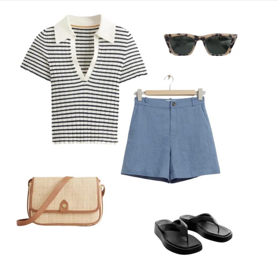 最后,也可以用高腰蓝色小短裤来配POLO款黑白条纹衫,不仅可以秀出纤细漂亮的腿线,还很穿衣显年轻哦,也是值得纳入夏日衣橱的蓝色系搭配。