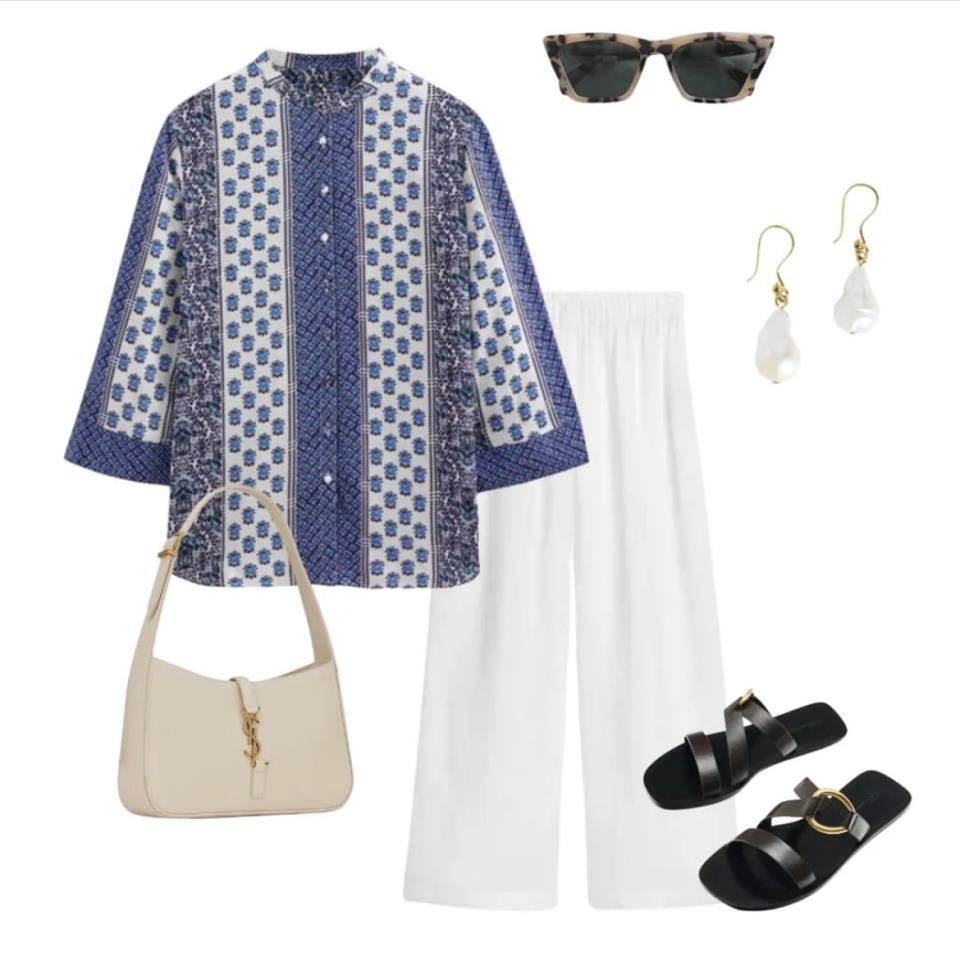 偶尔也可以挑战下蓝色为元素的图案,有趣的印花图案能为你带来不撞衫的时髦感,以白色阔腿裤来增加亮度,穿出海岸假日的悠哉风格。