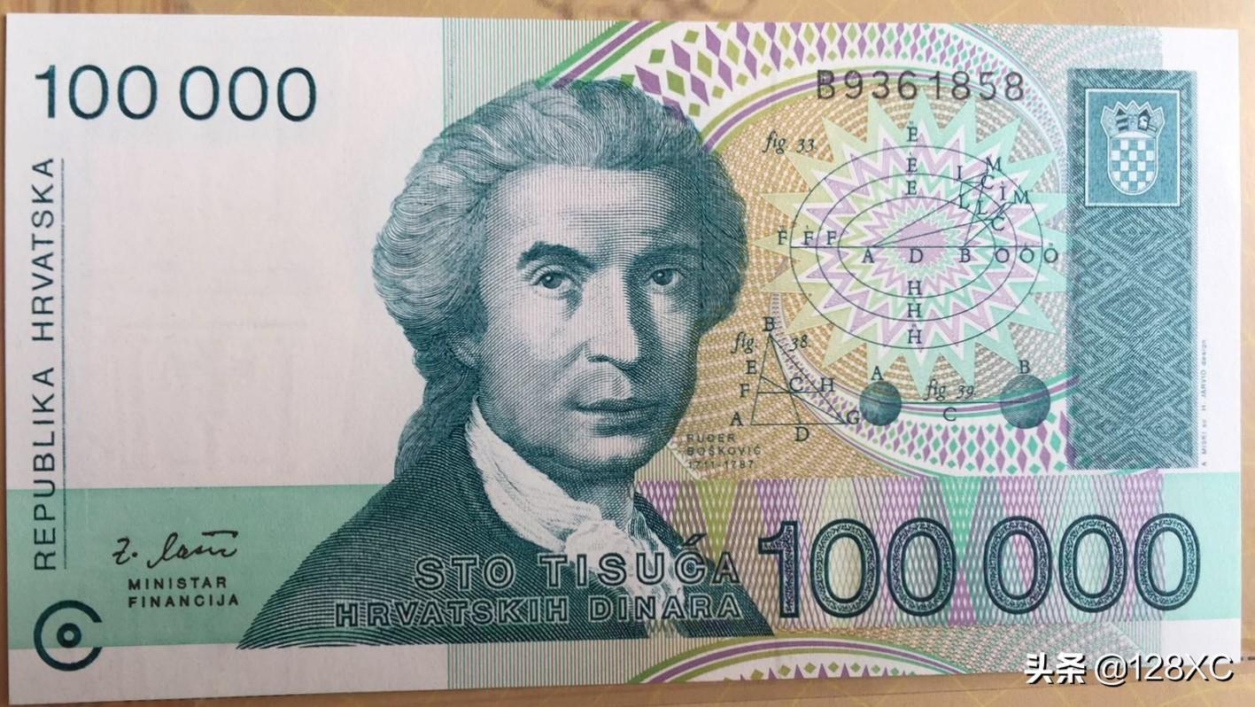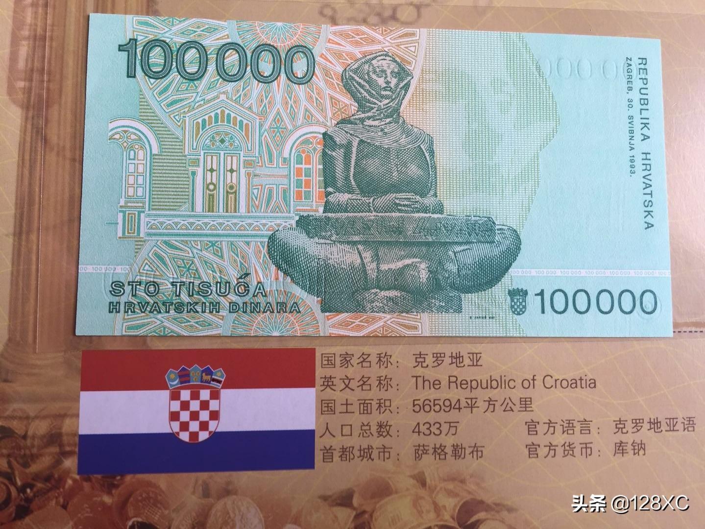 这张10万第纳尔纸币是上世纪90年代克罗地亚建国不久后的第一版货币,正面是克罗地亚数学家、天文学家、物理学家路德·博什科维奇,背面是克罗地亚之母雕塑,已于1994年停止流通,目前克罗地亚货币单位为库纳。Croatia, located in southeastern Europe, with its capital Zagreb, announced its secession from the former Yugoslavia on June 25, 1991, joined NATO in 2009, and joined the EU on July 1, 2013. On April 27, 1992, China recognized the Republic of Croatia. On May 13, 1992, China and Croatia established diplomatic relations. On January 11, 2015, kolinda grabar kitarovic was elected President, becoming Croatia's youngest and first female president since independence.