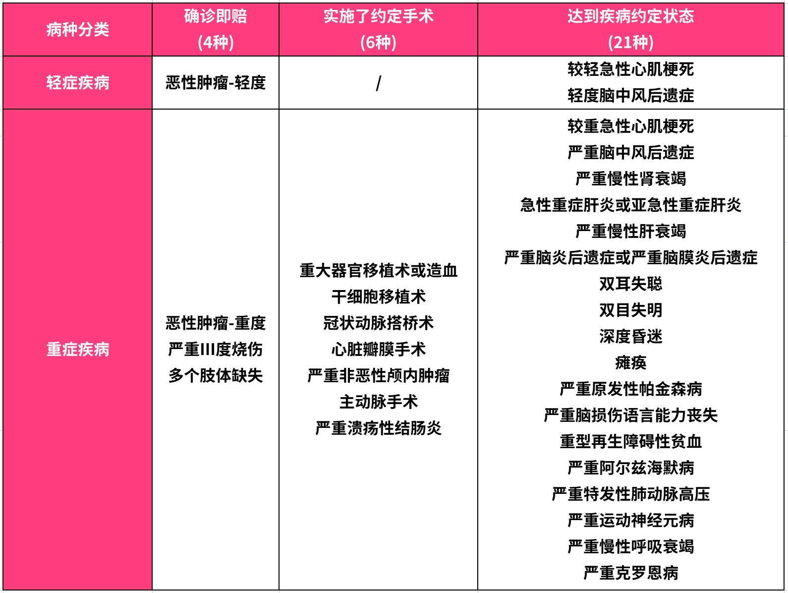 我们以法定的 31 种疾病(28 重疾+3 种轻症)为例,理赔率占据了95%,其中有4种疾病确诊即赔,有 6 种疾病做了手术才能赔,有21种达到疾病的约定状态才能赔。
