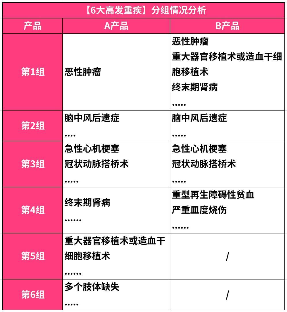 就像上图一样,明显的A产品要比B产品的理赔率要高,因为A产品的高发重疾多是单独分一组,比较分散,理赔率会更高。