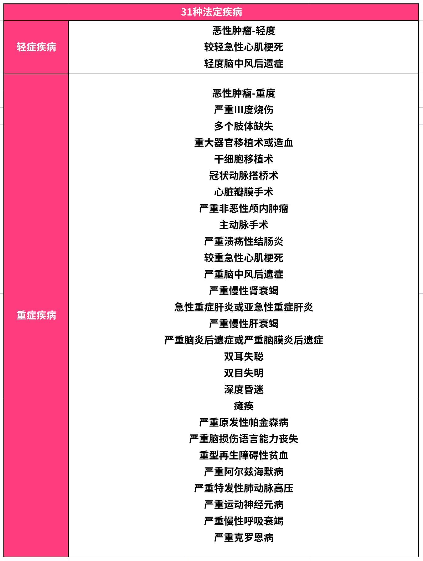 我们知道,银保监会规定了31种法定疾病,其中包含28种重症疾病和3种轻症疾病,这些疾病是所有的重疾险必须包含的,而且理赔条件也一样。