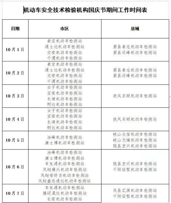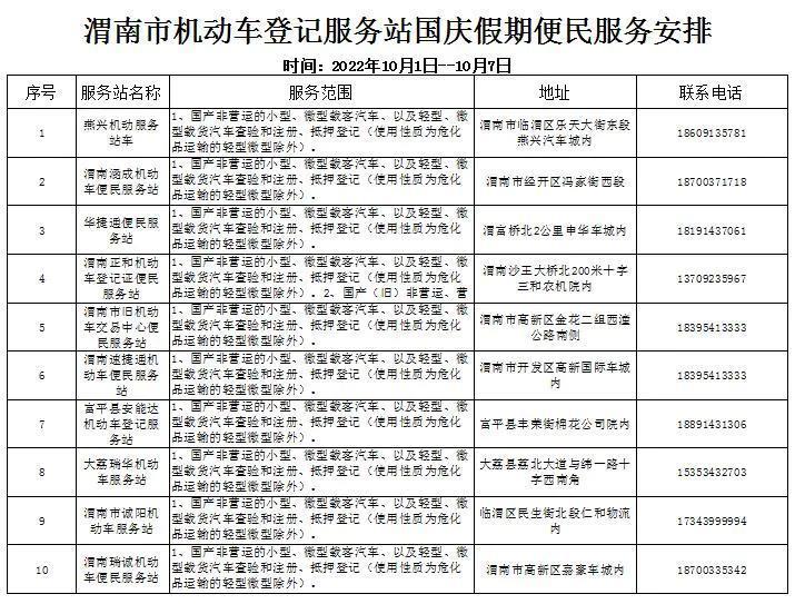 渭南市公安局交警支队车管所联合全市各机动车便民服务站及机动车检验机构(具体见附表)10月1日-10月7日正常办理车驾管业务,具体安排如下: