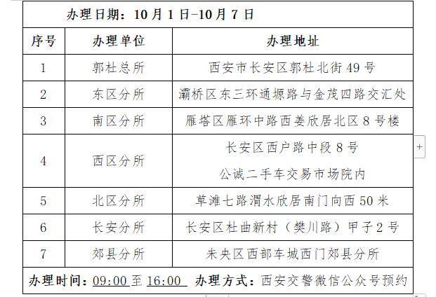 国庆期间,西安市公安局交通警察支队车辆管理所将为广大市民朋友们竭诚服务,请广大市民朋友们根据以上业务和时间办理。为了保障安全健康,在窗口办理业务时,请大家主动配合扫码、测温、戴口罩,保持一米线,让我们共同筑牢疫情防控防线,文明过节,共享喜悦。