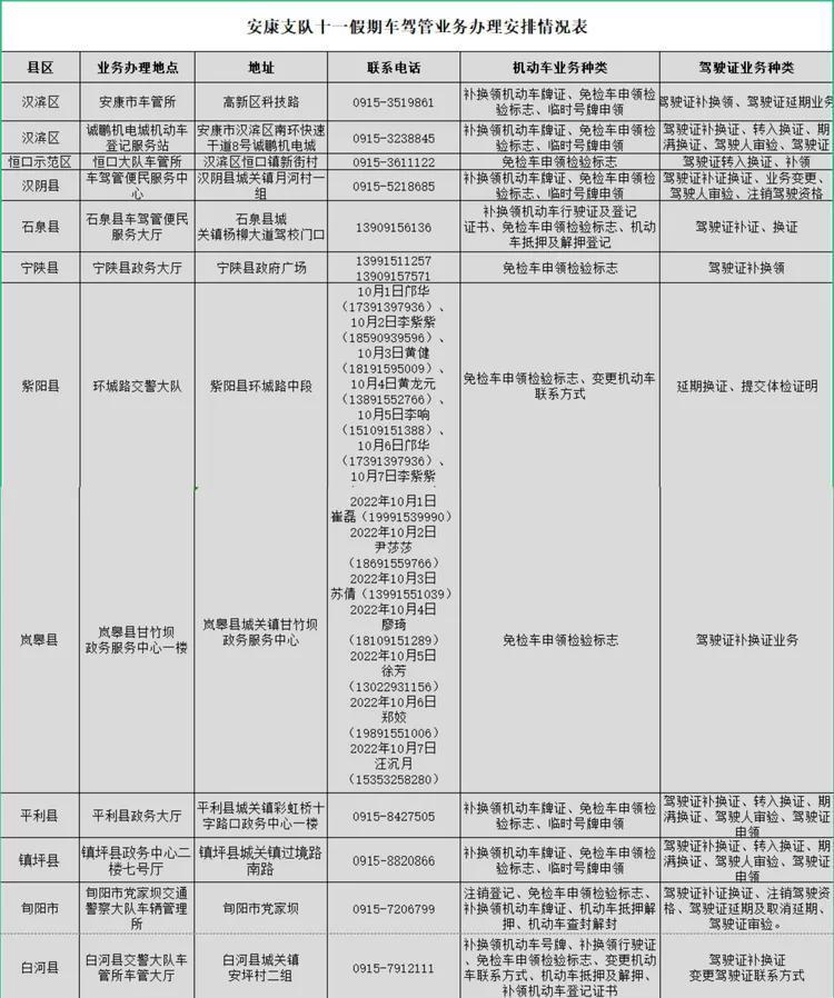 为深入落实公安交警“放管服”改革措施,方便广大群众国庆黄金周期间办理车驾管业务,结合疫情防控形势,陕西西安、铜川、宝鸡、渭南、安康、延安、榆林车管所开展“国庆我在岗、服务不打烊”活动 ,部分车驾管业务可正常办理。具体情况如下: