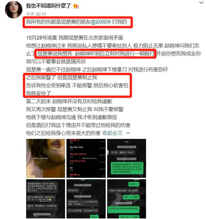 她表示,2020年10月28号凌晨,自己和屈楚萧在北京家里闹矛盾,屈楚萧打电话叫来赵晓坤,赵晓坤对她进行殴打,还动了刀。