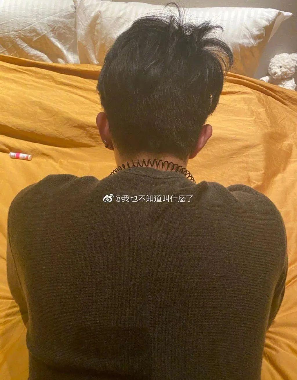 以及一张戴耳钉男生趴在床上的背影照,指向屈楚萧。