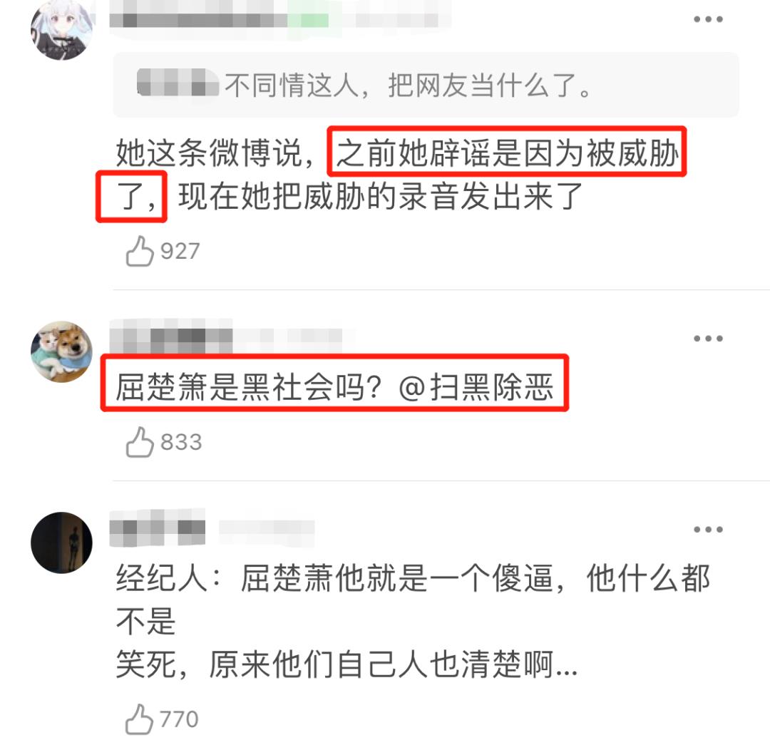 针对女生爆料的“威胁、殴打”等内容,屈楚萧方面没有直接否认,只强调女生曝光的录音有剪辑,女生曾对他们进行勒索。