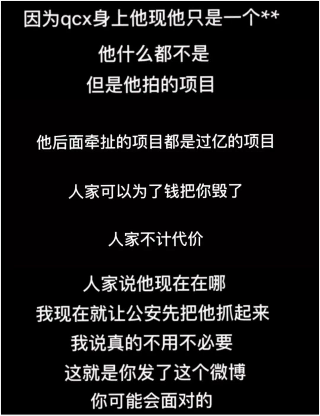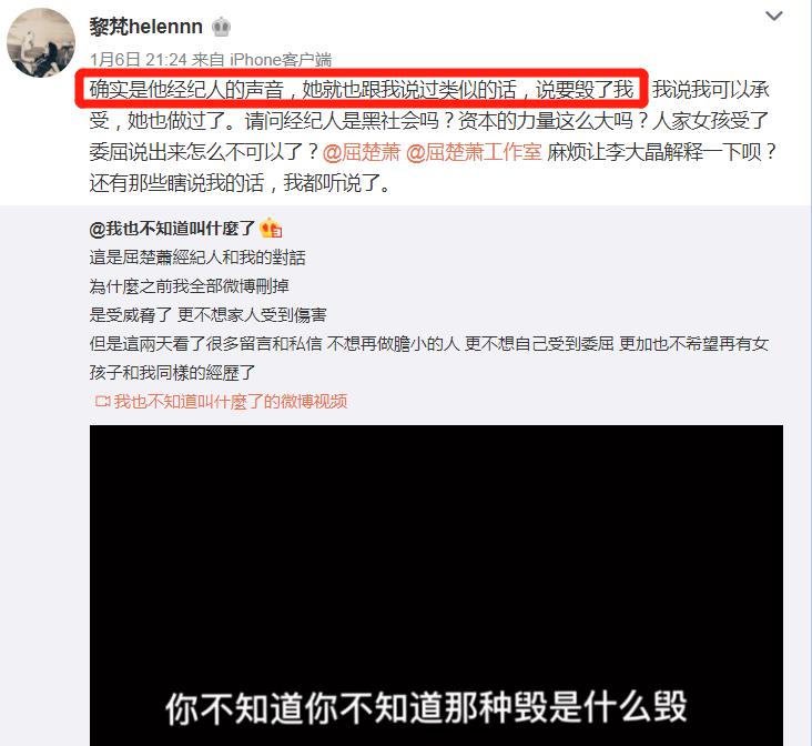 女生已经被吓哭了,经纪人开始转换规劝思路,表示现在不是屈楚萧要威胁她,而是屈楚萧所拍摄作品牵扯到过亿的项目,所以不容许出现舆论上的差错。
