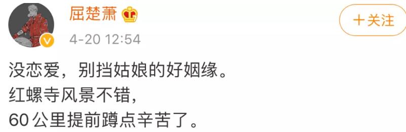 截至目前,屈楚萧都没有再更新,微博给他这条匹配的标签也很个性,“每天了解一下渣渣。”