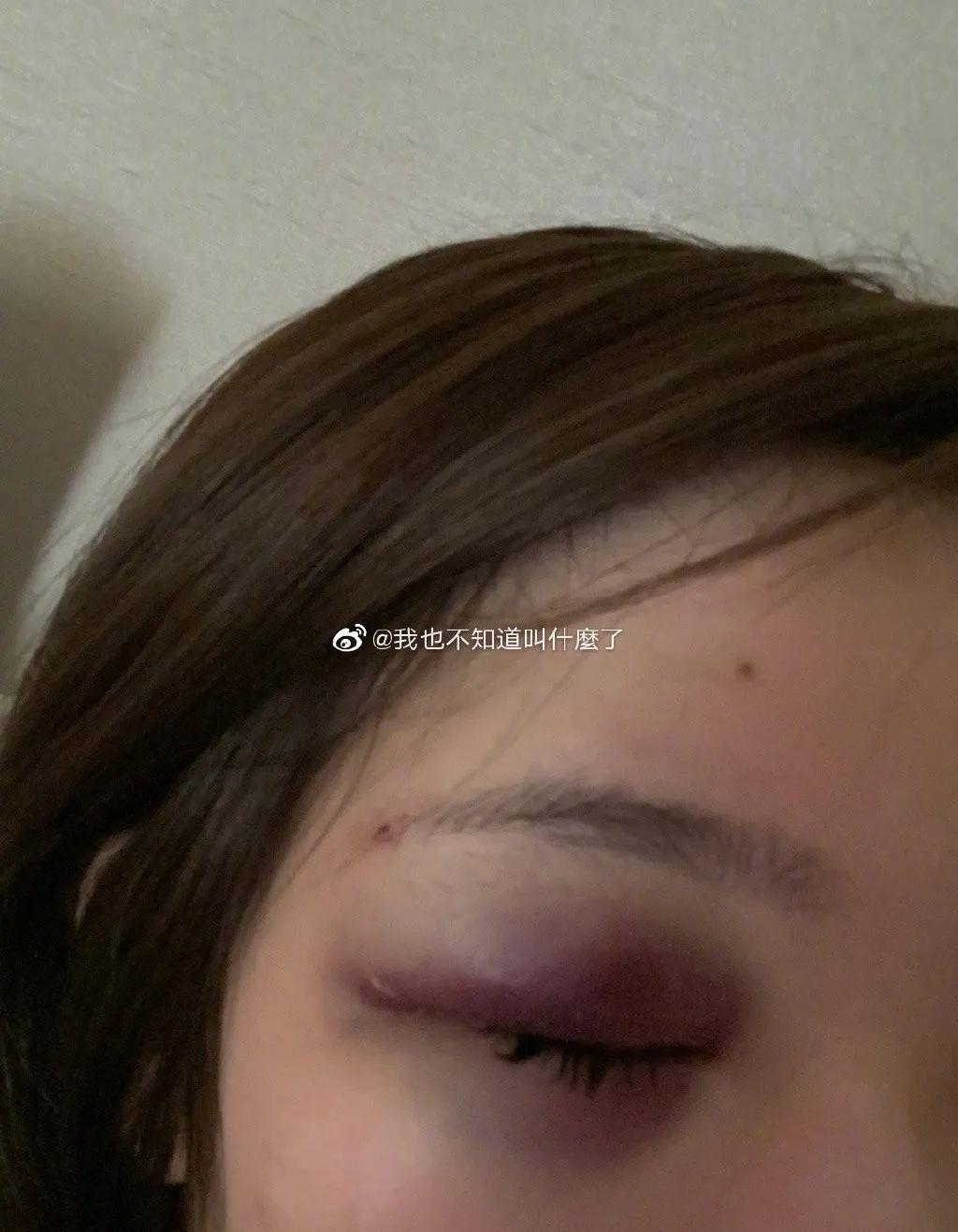 女生提供了一些受伤照片,眼睛被打肿充血、四肢有淤青,还出现一些利器伤痕。