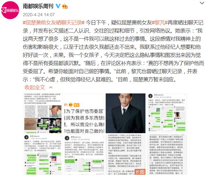 昨晚,上一个爆料的前女友黎梵还转发了这个爆料女生的微博,表示自己也被屈楚萧经纪人威胁过,支持女生锤爆对方。