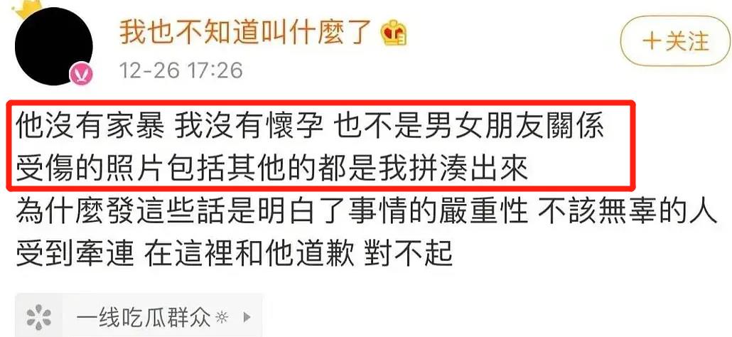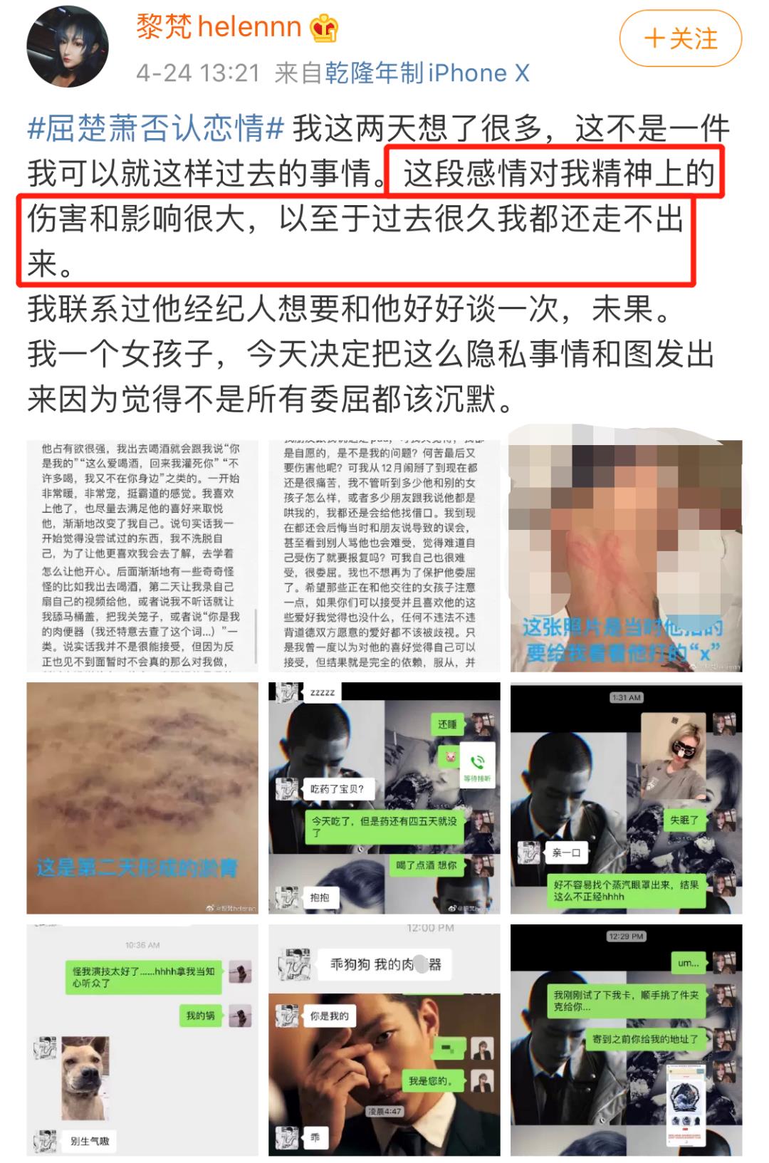 26号,女方突然发文否认一切,表示家暴、怀孕、恋爱都是假的,受伤等照片是P的,并向屈楚萧道歉。