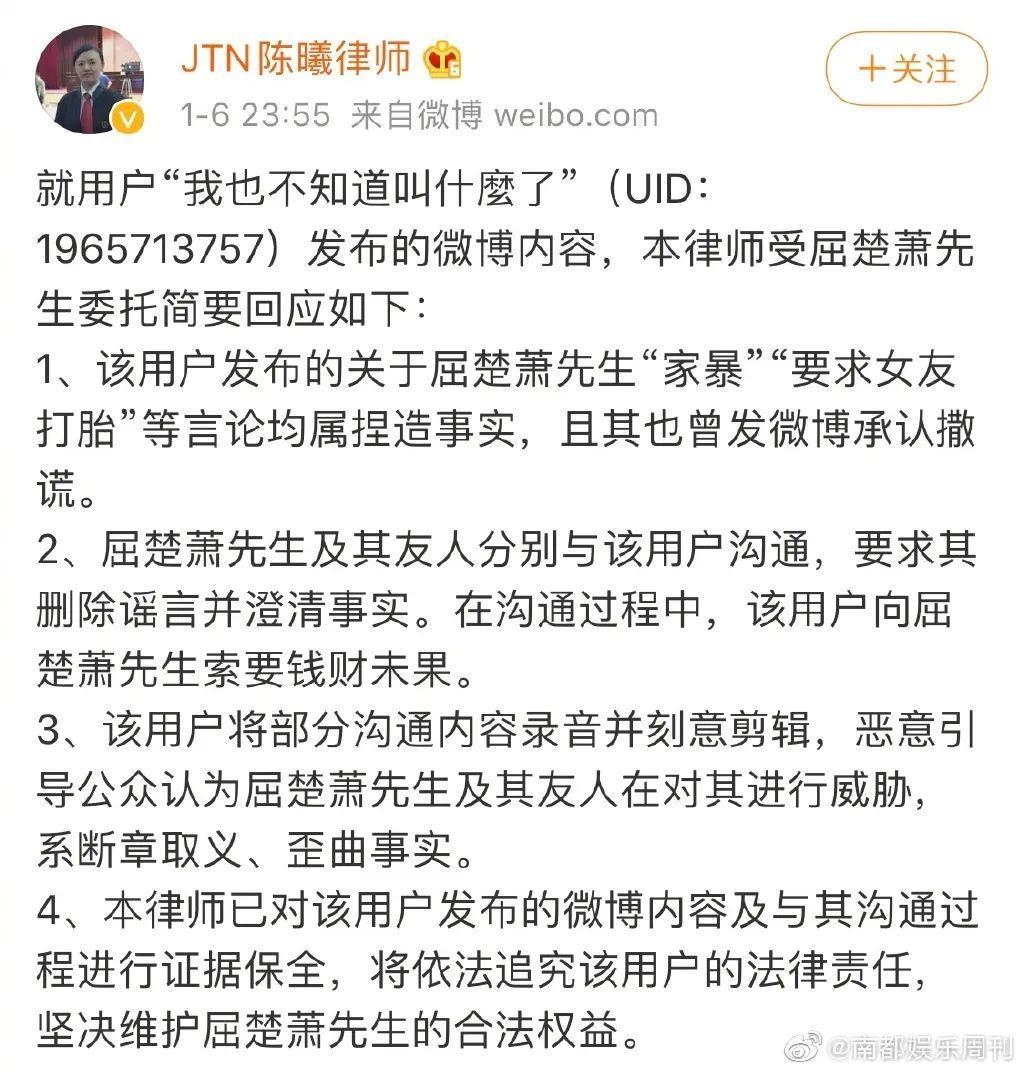 屈楚萧方委托律师回应称,女方在沟通过程中向屈楚萧索要钱财,还恶意剪辑录音误导公众,“家暴、要求打胎”都是不实言论。