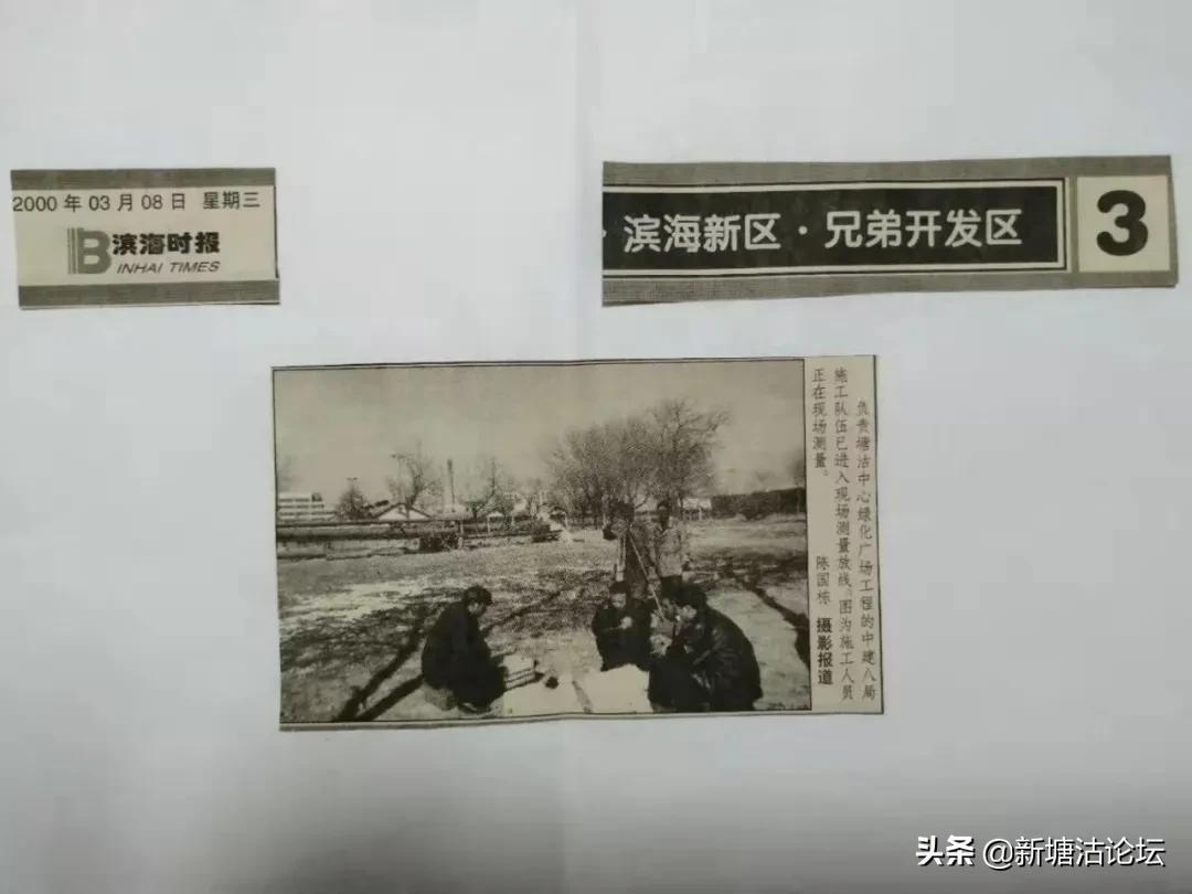 《滨海时報》2000年3日8日“滨海新区•兄弟开发区”专栏图片新闻報道。施工人员进入现场测量放线,研究方案