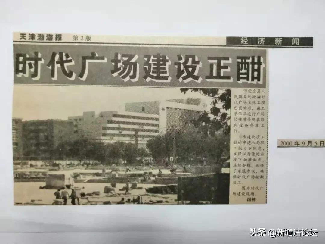 又经过广大施工人员的团结奋战,进度逐步加快。进入9月,这座倍受人民瞩目的广场,改名时代广场,主体工程已现雏形,已经进行广场硬质景观装修和设备安装工作。他们工假日不休息,加班加点,连续奋战,确保时代广场按期竣工。我拍摄了一个整体施工场面,在2000年9月5日在《天津渤海报》二版发表了“时代广场建设正酣”图片新闻······。