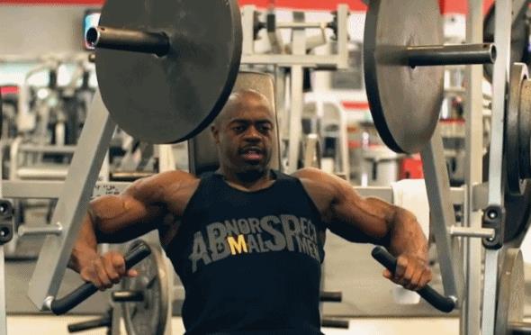 16.站姿杠铃片胸前推(主要刺激胸肌中缝)