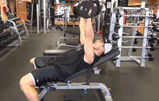仰卧于上斜30~60度的训练椅上,正手握杆,双手距离略宽于肩,将杠铃降低至落到下颚前1寸左右,向上推举杠铃至手臂伸直。