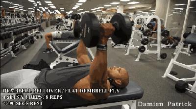 上背部仰卧在健身凳上,头部稍露出凳端,两腿弯曲,腰背部放松,臀部下沉,挺胸收腹,两臂弯曲,双手于头顶处交叉握住哑铃一端的内侧,掌心向上,哑铃下垂,双手持铃慢慢屈肘向头顶处落下降,使胸大肌充分扩展,当哑铃降至最低位置后,发力还原。