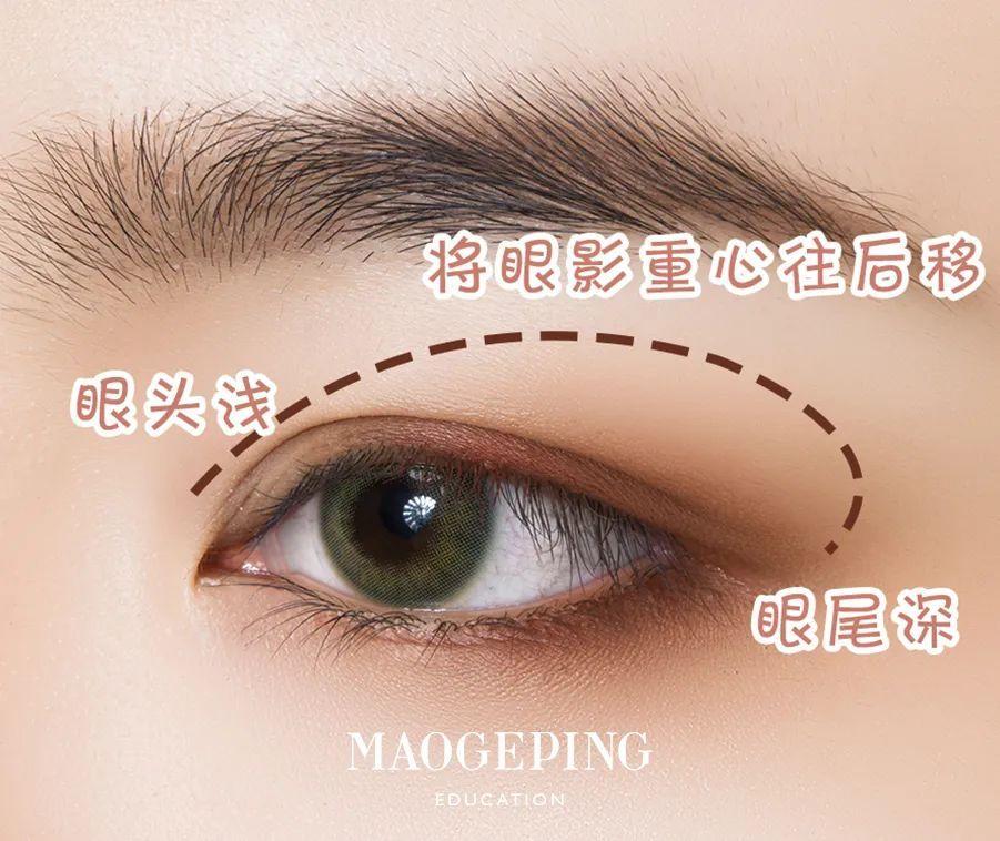 眼影采用后移的画法,眼头浅、眼尾深,将眼影重心往后移。