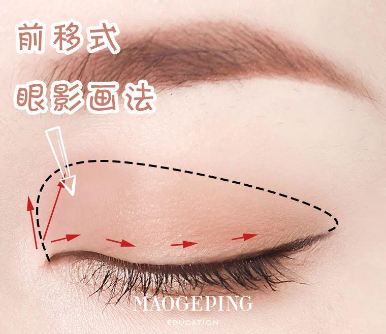 眼影用前移式的画法,往里集中,使两眼距离平衡,也能让鼻梁显得更为高挺,整体五官也会变得更立体!