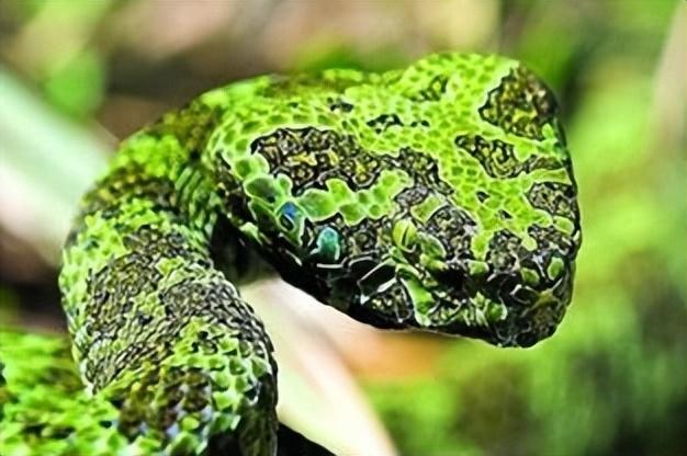 莽山烙铁头又被称为:“莽山原矛头蝮”、“中国小青龙”,属于蝰蛇科成员,它们的长度平均在2米以上,并且身体粗壮有力,全身呈现深绿色,头部呈现三角形状,和之前几个不同的是它的三角形是“倒三角”。