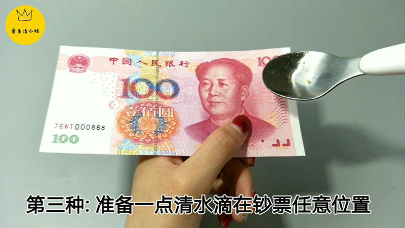 方法三:滴水法,用一滴水滴在钞票的位置,用手搓一下很容易起毛