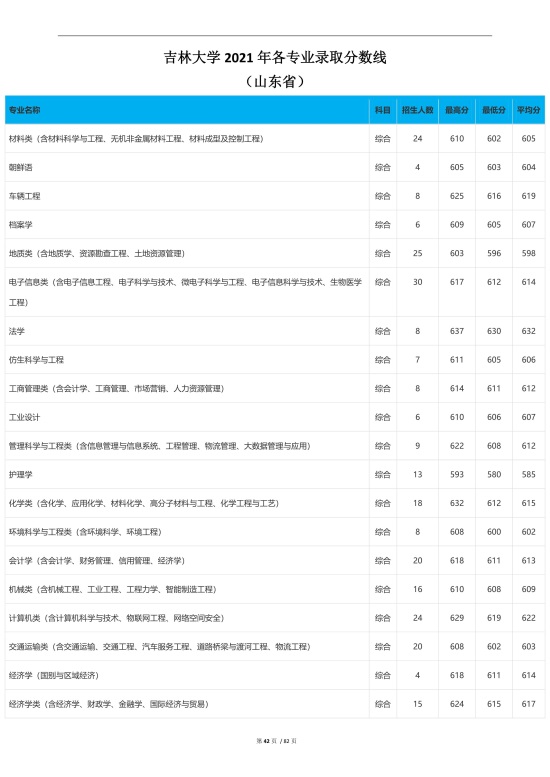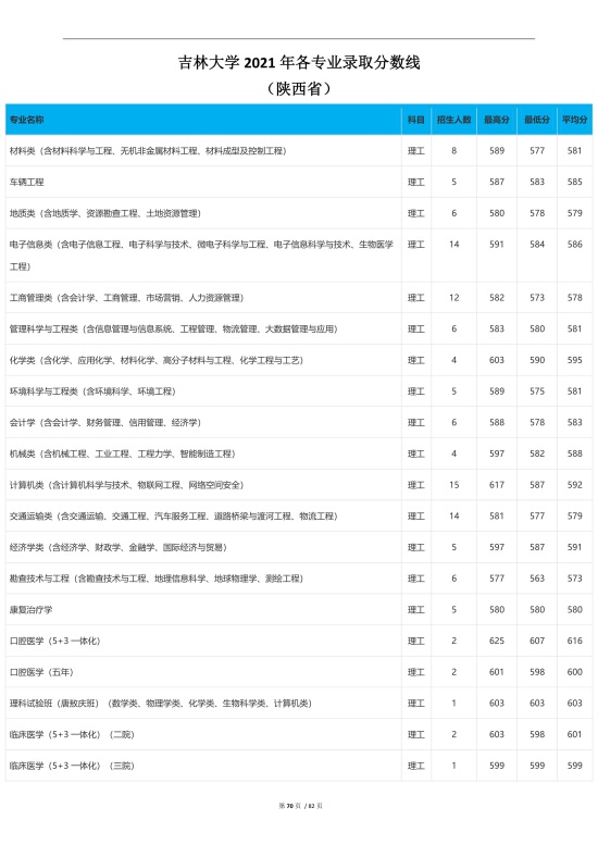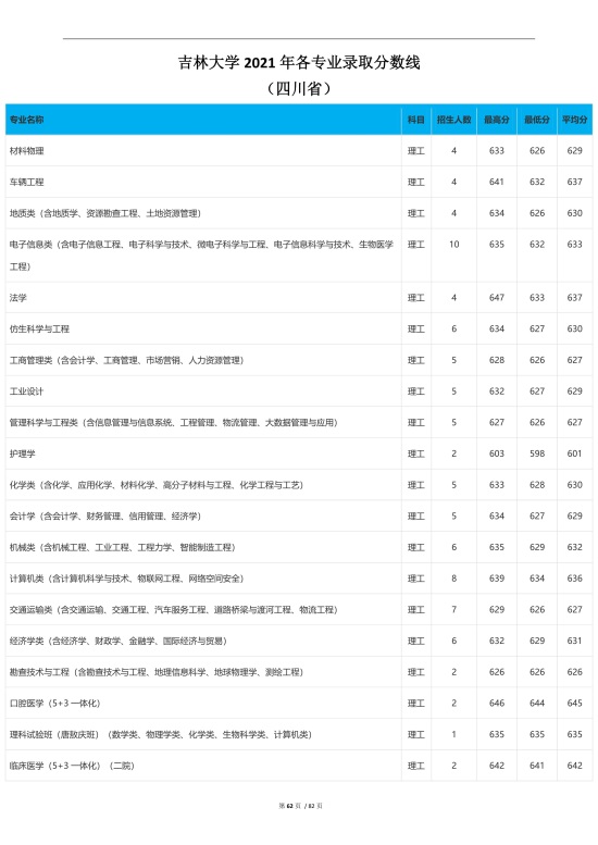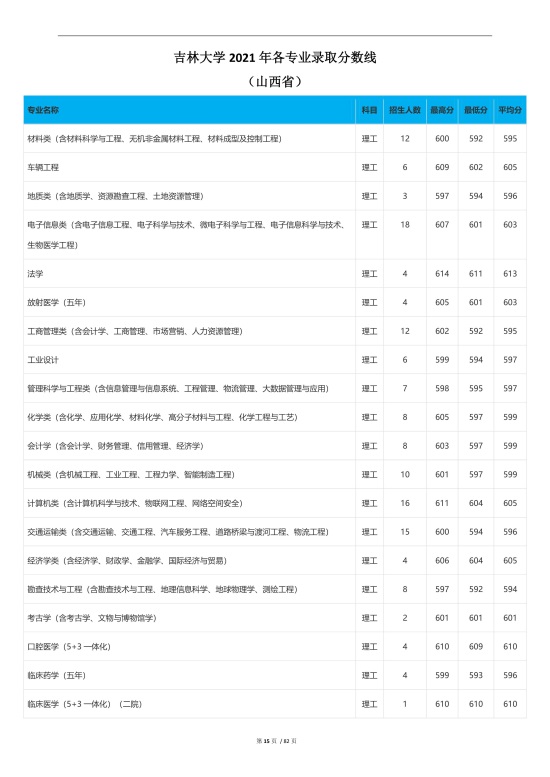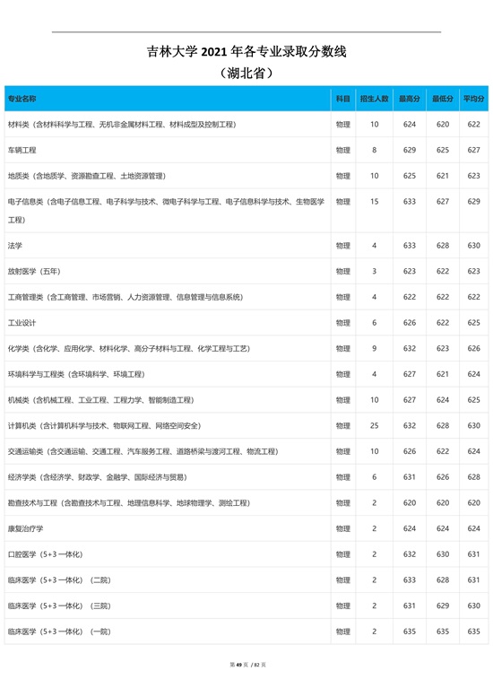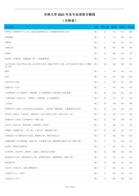吉林大学2021年在各省市本科招生的专业录取分数线如下: