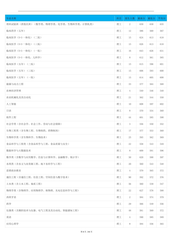 临床医学(5+3一体化)(二院)专业的录取分数线最高,录取最低分为630分。环境科学与工程类(含环境科学、环境工程)专业的录取分数线最低,录取最低分为607分。
