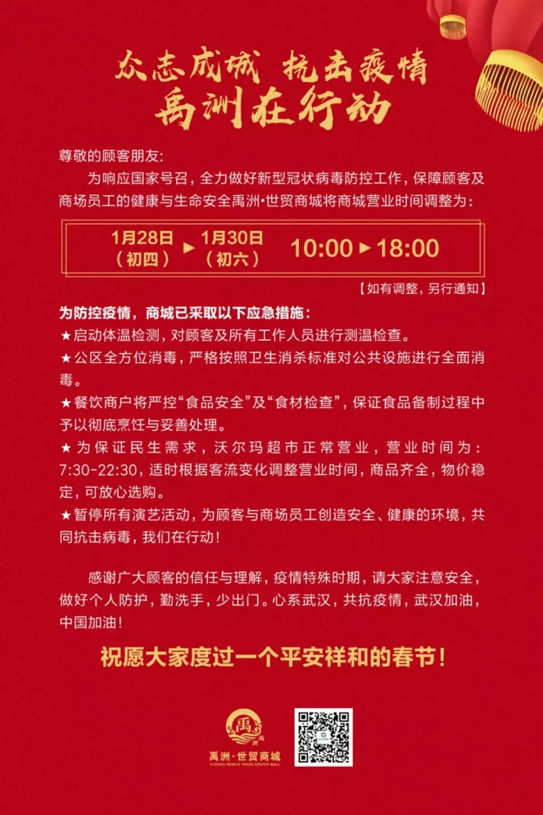 其中沃尔玛超市营业时间调整至7:30-23:00