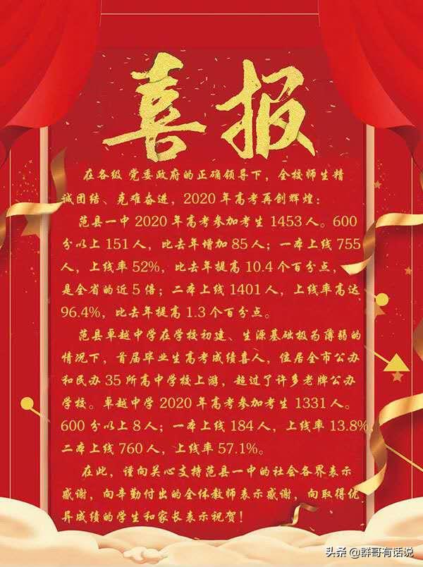 范县一中2020年高考参加考生1453人。600分以上151人,比去年增加85人;一本上线755人,上线率52%,比去年增加10.4个百分点,是全省的近5倍;二本上线1401人,上线率高达96.4%,比去年增加1.3个百分点。