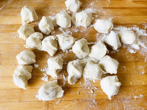 6、面团醒好后,移到案板上,搓成长条,再揪成比平时水煮的饺子皮稍大一些的面剂子。