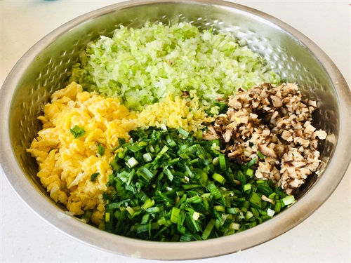 5、醒面的过程准备饺子馅儿。将白菜洗净控干水分,先切成条,再切丁儿,最后再剁成小颗粒;香菇洗净后,攥出多余的水分,再切成小颗粒;将三颗鸡蛋的外皮先清洗干净,蛋液打入碗中,锅中倒少许油,将蛋液倒入划散成小块儿,熟后盛出备用;韭菜洗净控水后切碎末;姜切碎末,将全部加工好的食材统一放入大盆中,姜放最上面,再用热花椒油浇在上面,调入盐、生抽,搅拌后馅料即完成。