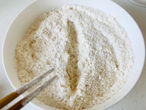 2、用筷子搅拌一下,使盐均匀分布在面粉中,然后再用筷子将面粉一分为二,划出一条界限。