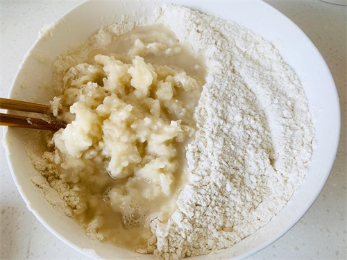 4、另一部分面粉倒入不烫手的温水,也是边倒边搅拌,根据干稀情况停止倒水,待另一部分面粉不烫手时,下手揉成面团。余下的面粉用温水和,可保证蒸出的饺子皮劲道,口感好。