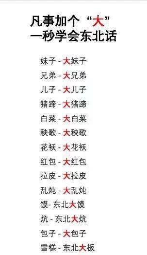 另外在东北语法中不可或缺的形容词就是—— “大”。据说,不管啥词儿只要在前面加个“大”字,准保马上变成东北话。