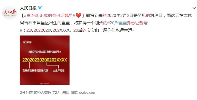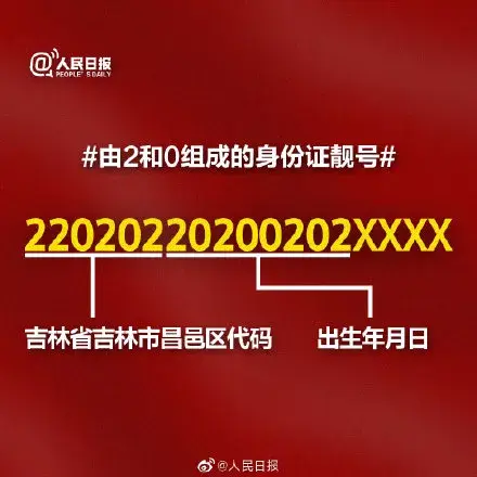 即将到来的2020年2月2日是罕见的对称日,而这天在吉林省吉林市昌邑区出生的宝宝,将获得一个别致的身份证号。↓↓↓