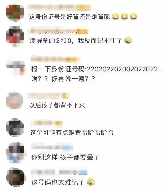 不过,也有网友提前为孩子开始担忧,比如提出一个灵魂拷问:“这身份证号是好背还是难背?”还有网友说:“你别这样,孩子都要晕了……”