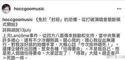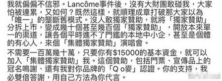 而最近袜子精何韵诗戏份变多,昨天在fb上说:自从兰蔻事件后,就没公司敢找我合作了。现在我要开演唱会,是希望板着脸的赞助商来看,还是喜欢我的歌迷来?当然是歌迷。所以现在开演唱会没赞助,请大家众重酬。