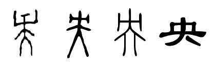 央的甲骨文字形像人脖子上戴着木枷的样子。因枷锁是铐在身体正中的脖子上,因此“央”有正中、中央之义。人脖子上戴上枷锁,是灾祸临身,因此“央”加“歹”即为“殃”。遭殃受刑之人心情很痛苦,“央”加“忄”即为“怏”,此人必定是“怏怏不乐”了。带枷受刑会哀恳求情,因此有“央求”一说。