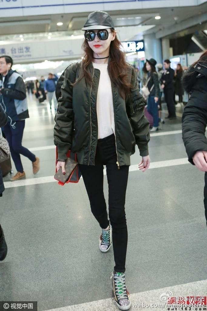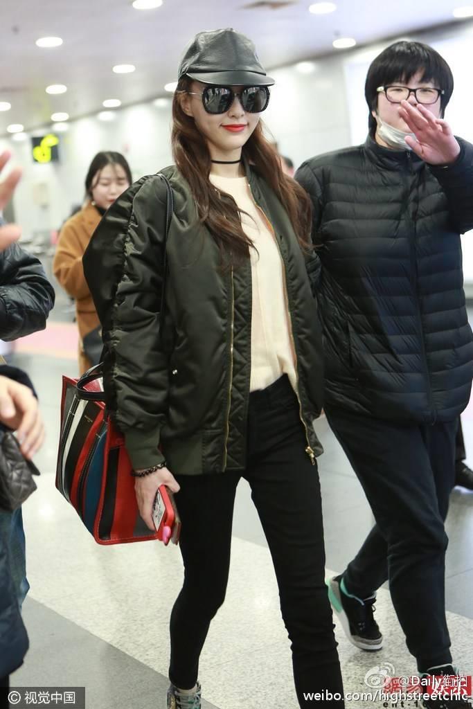 唐嫣北京飞往上海机场街拍,军绿色夹克外套和大红唇,目前正在恋爱中的她笑容甜蜜~